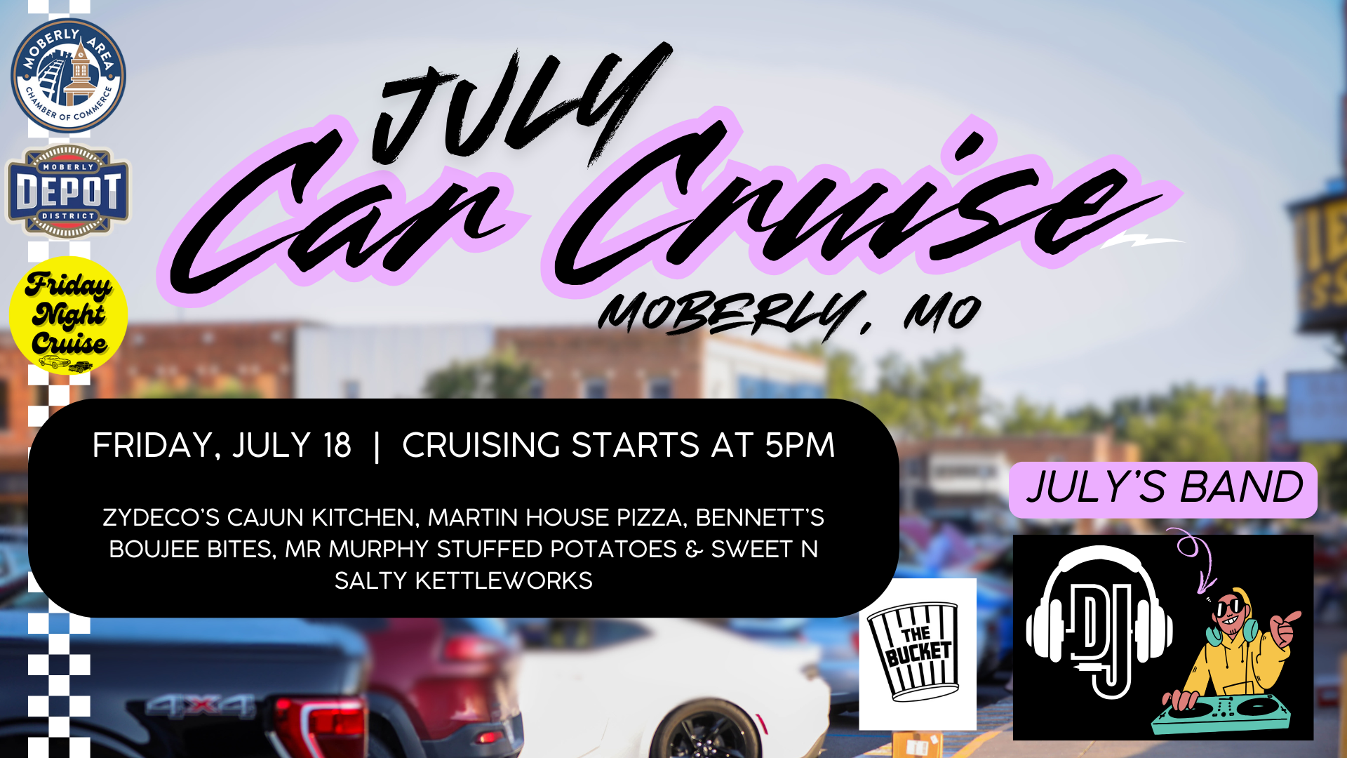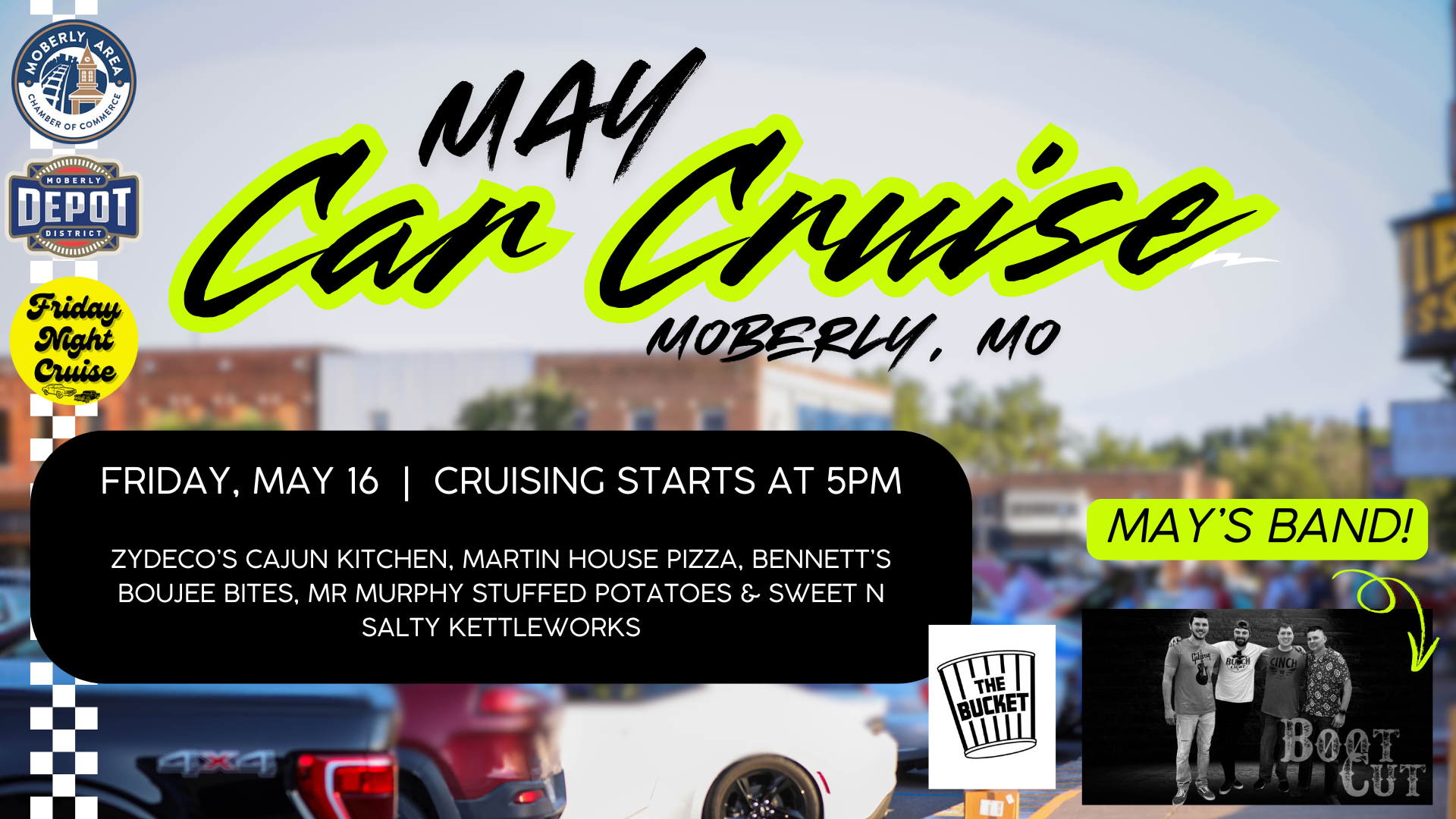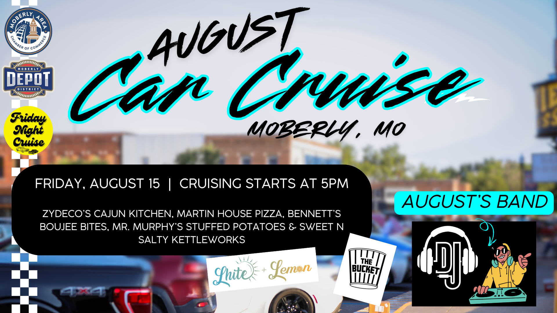 Get ready for a night of roaring engines, polished chrome, and camaraderie as we roll into the Friday Car Cruise! Hosted by the Moberly Area Chamber of Commerce, this monthly event brings car enthusiasts, families, and community members together for an unforgettable evening of cars, music, food, good vibes, and great conversations.