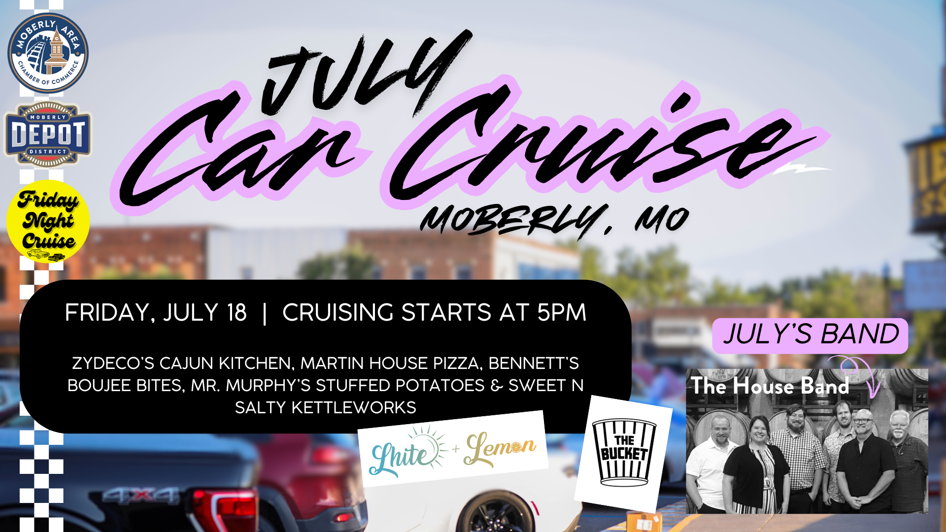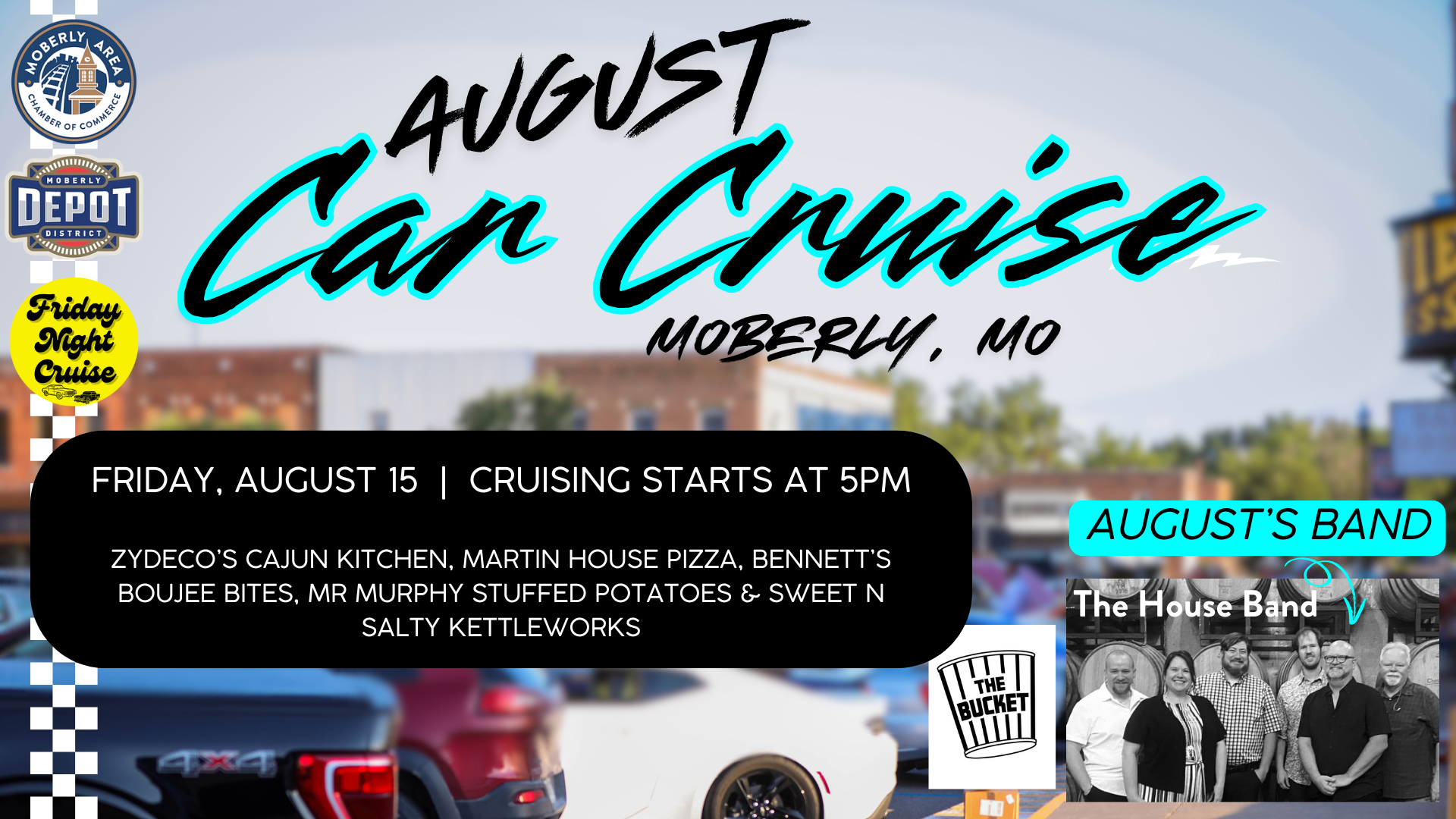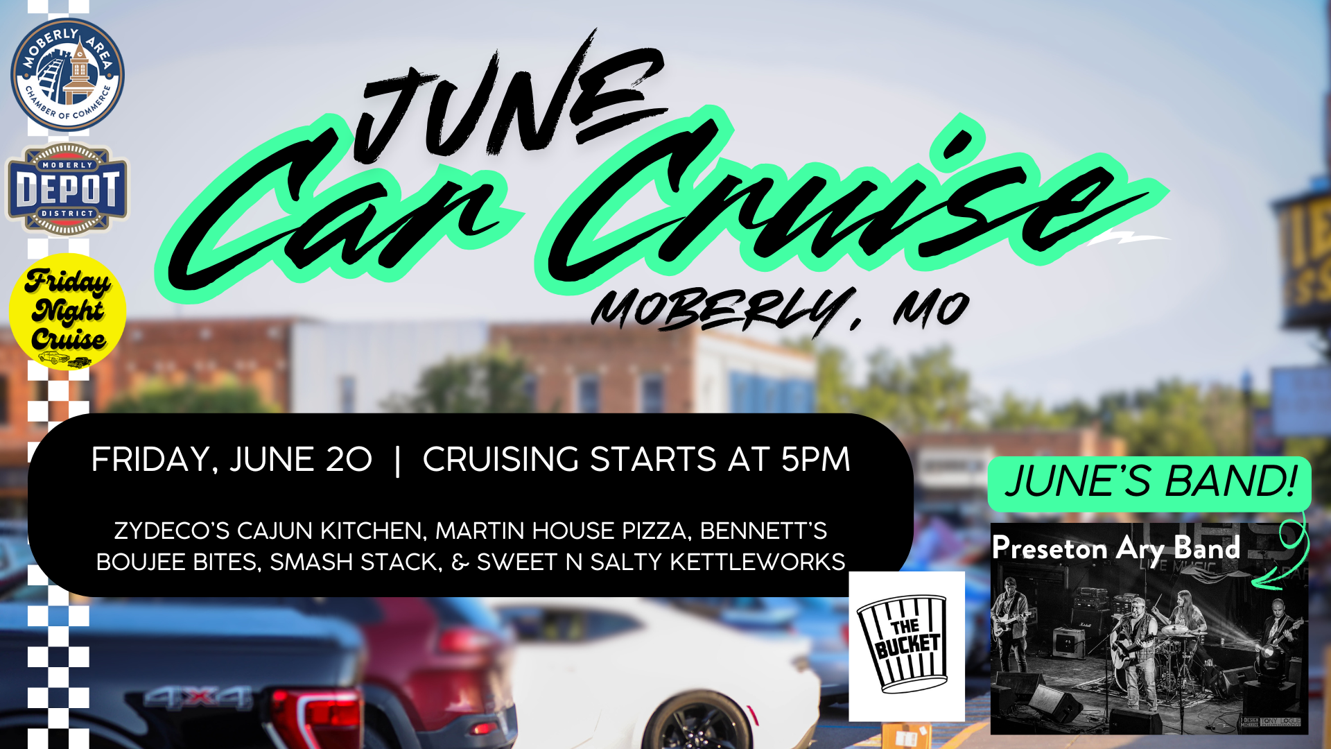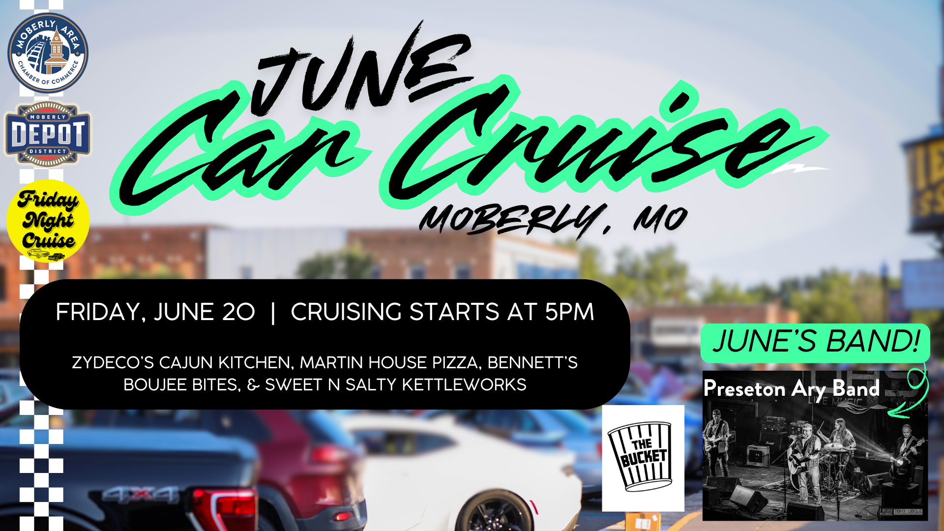Get ready for a night of roaring engines, polished chrome, and camaraderie as we roll into the Friday Car Cruise! Hosted by the Moberly Area Chamber of Commerce, this monthly event brings car enthusiasts, families, and community members together for an unforgettable evening of cars, music, food, good vibes, and great conversations.