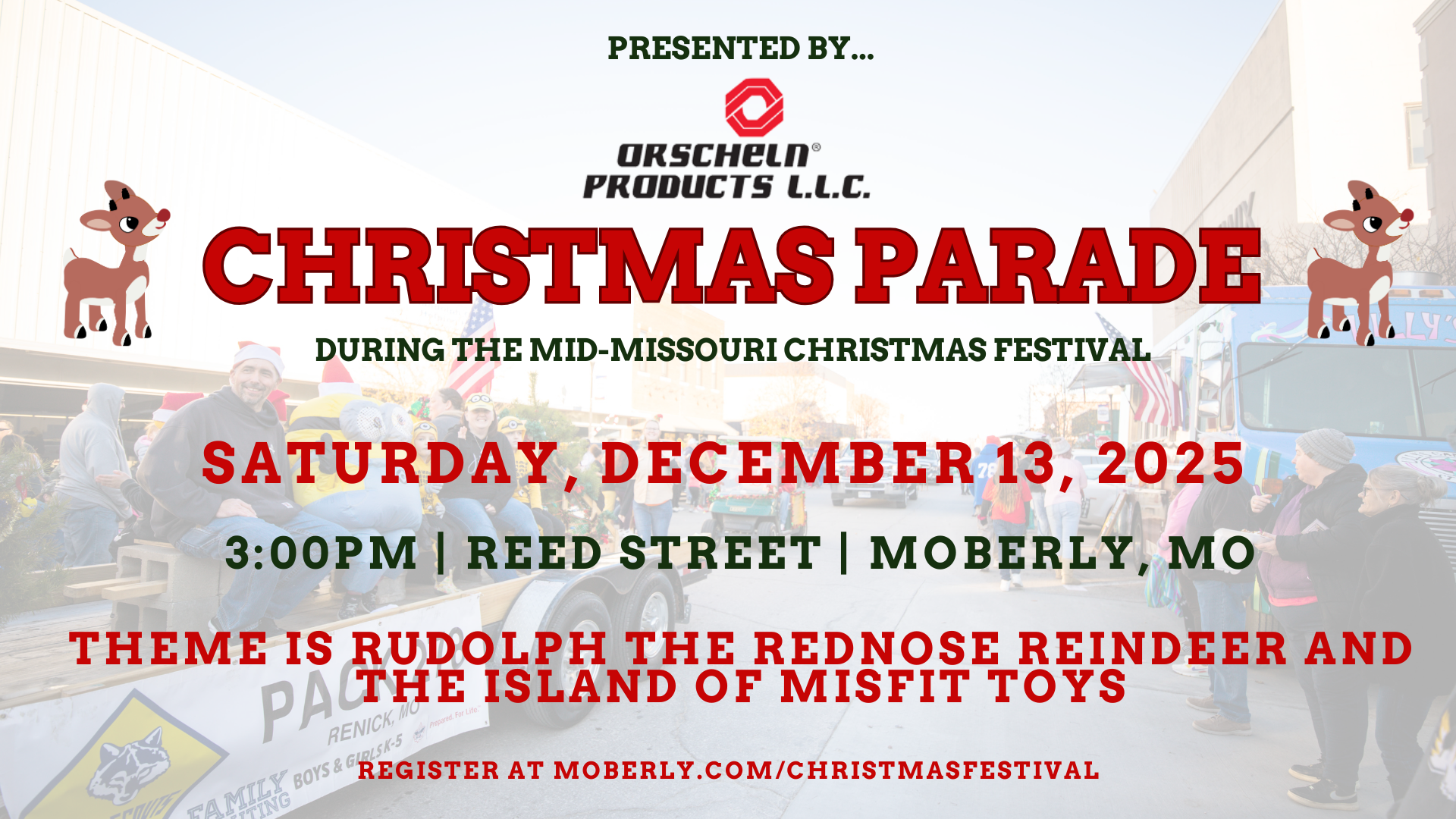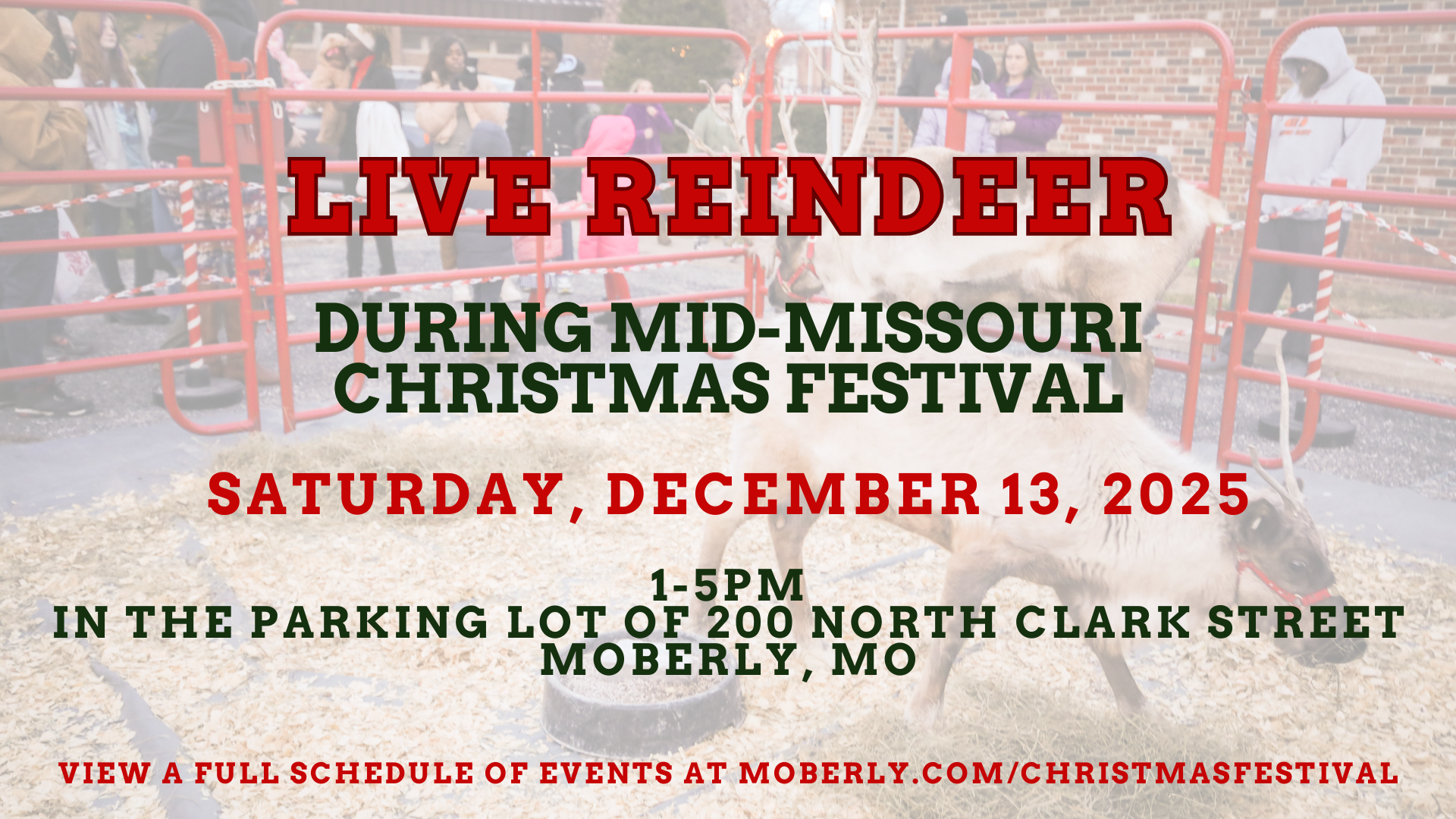 Mid-Missouri’s Christmas Festival is held every second Saturday in December. This year’s event will be Saturday, December 13, 2025 in the Moberly Depot District which will include pop-up shops, a Christmas parade, live reindeer, horse drawn carriage rides, Altrusa’s Cookie Fest, pictures with Santa, activities, vendors, Mayor’s Tree Lighting, shopping, ice skating rink and dining with local businesses and more.