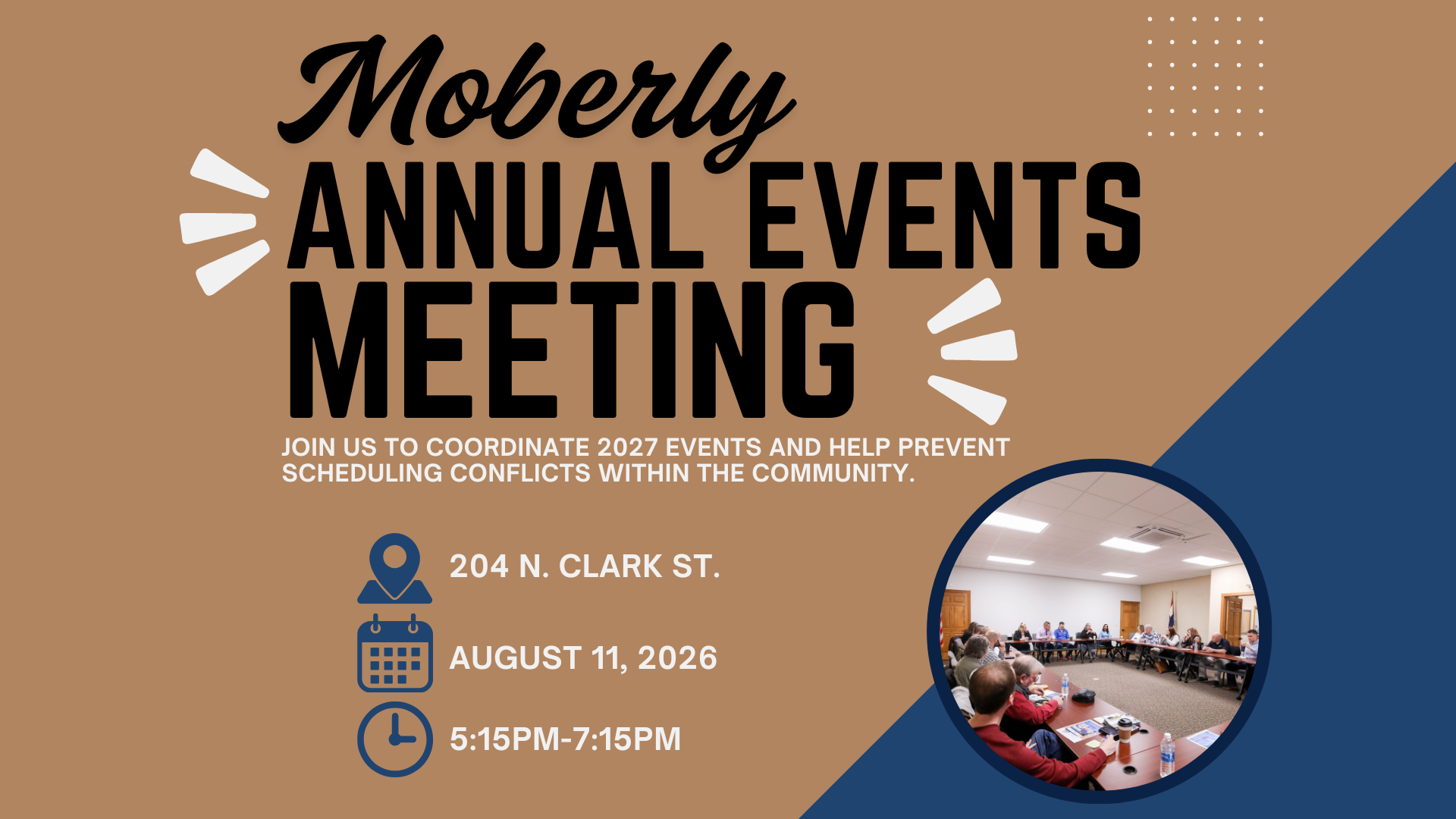 Join us on August 11, 2026 for the Moberly Annual Events Meeting, where community members come together to share ideas, coordinate event dates, and collaborate on making Moberly’s events even better. Let’s work together to build a strong, successful event calendar for our community.